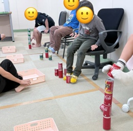 椅子に座って足先で空き缶をはさみ、積み上げていく「空き缶タワー」に挑戦!集中して慎重にタワーを作る表情はとても真剣で、見事に積み上げることができた瞬間には「できた!」と嬉しそうな笑顔があふれていました👏👏